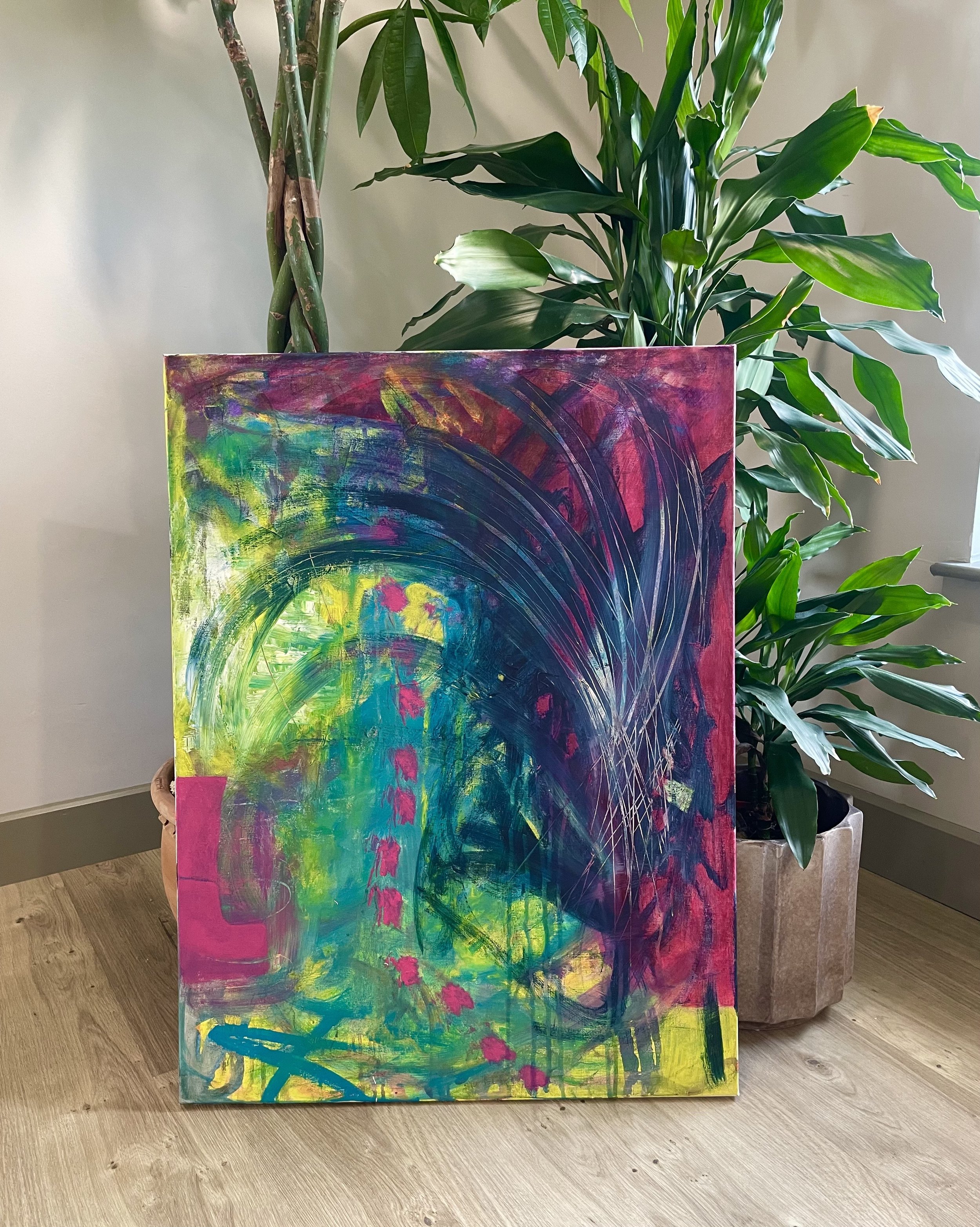 My practice is playful, curious and experimental. I don’t conform to one particular style of painting. Instead, I paint what I feel either inspired to, or compelled to, depending on the day. Bright, saturated colours feature heavily, often juxtaposed with deep, sultry tones.